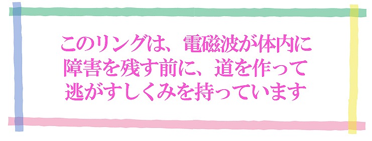 このリングを着けると、5Gなどのマイクロ波は、高周波の表皮効果により、身体の表層を伝ってこのリングに誘導され、空中に排出されます。