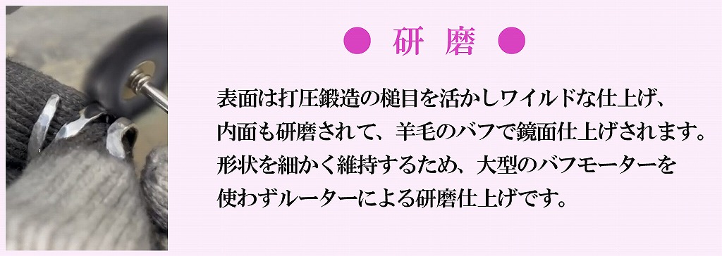 でも実はこのリングは甲丸形状に打圧を加えて行き、打ち目をヤスリで慣らして鏡面仕上げするという、二手間も三手間もかけた逸品です。